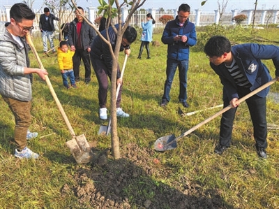 植树节当天上午,由该公司职工组成的“植树志愿团”手持铁锹在江东中心泵站的土地上种下一棵棵小树苗。