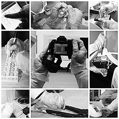 这是警察序列中的一个神秘领域,色彩单一,蓝、白、灰构成了工作环境的主基调;静谧,恒温恒湿,一件件样本送进来,又“走”出去,最终化作图形、数字、符号永远地“定格”在纸面上,呈现在细节中。