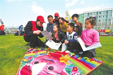 3月26日下午,春风送暖。在平湖樱花小镇举办的平湖首届樱花节热闹开幕,五彩斑斓的风筝飞上了蔚蓝的天空。当天,平湖市供电公司志愿者们对演出现场进行了全面隐患排查,并针对性宣传了电力线路保护区附近禁止放风筝的相关知识。图为供电志愿者正在为孩子们讲解电力设施保护知识。陈思思