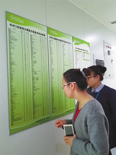 | 杭州口腔医院走廊张贴的价格表,字迹较小。 记者王艳 摄 |