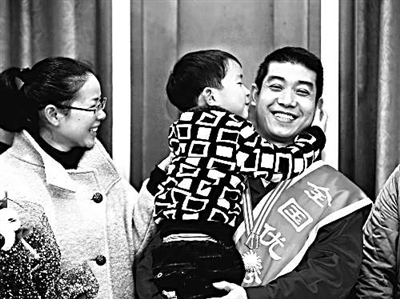 | 李从撑从北京载誉归来,与妻儿喜相会,年幼的儿子一把抱住他,亲了一下。 |