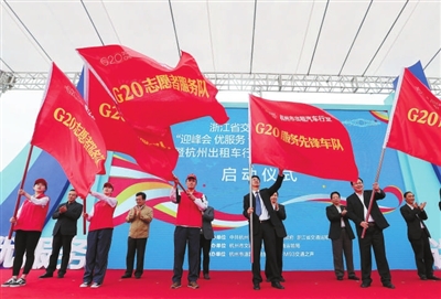 启动仪式后,杭州市随即开展“服务G20,的士当先锋”出租车服务质量大提升主题活动,包括“文明礼仪大教育、车辆形象大改善、服务保障大投入、市场秩序大整顿、先锋模范大创建”系列活动。
