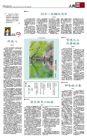 作为凡尘中的一员,谁都会受外界的伤害。怨恨可谓人人共有,而且不只是简单的怨与恨,往往爱恨交加、羡慕与嫉妒混杂、自傲与自卑相融。怨恨属于情感的自然流露,但正如人的欲望发自本能,却必须理性约束。怨恨如水,若不及时导流,将在人的心中积成“堰塞湖”。因此,在湖水漫溢前必须加以疏通,以免怨恨演变为人们根深蒂固的情绪习惯,从而愈积愈烈,酿成一场既伤人又伤己的身心折磨。