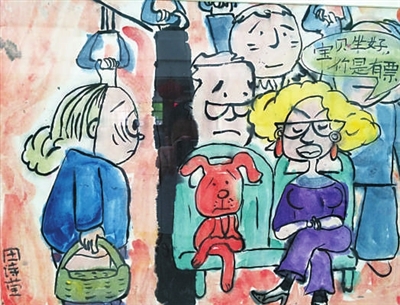 | 《宝贝坐好,你是有票的》,作者用简洁的线条和拟人化的手法,将公交不文明现象刻画得入木三分,颇具讽刺意味,而这幅作品也获得了一等奖。 见习记者胡翀 摄影报道 |