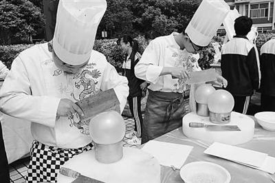 4月12日,绍兴柯桥举行职业学校毕业生就业推介、技能展示暨现代学徒制校企合作签约活动,吸引了区内280多家企事业单位前来“纳贤”。烹饪专业的毕业生在气球上秀刀功,显示他们在学校所学扎实功底。钟伟 陈芳 摄