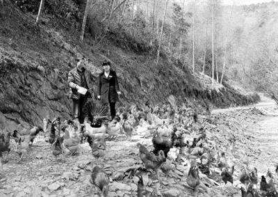 地处开化县桐村镇严村的念红家庭农场依山傍水,生态养殖白毛乌鸡等土鸡,主要用玉米、米糠作为鸡吃的主食,采取山地、小溪边放养。该农场去年共有4000多只成品土鸡销往江西和本省杭州等地,目前存栏鸡供不应求。图为业主邹念红(左)正在给土鸡喂食。