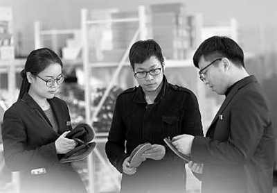| 微贷中心工作人员与郑寅(中)交流鞋子制造工艺。 |
