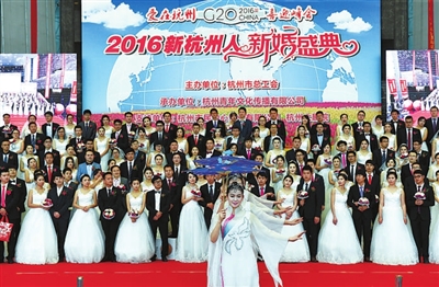 2016年百对新杭州人集体婚礼,自今年2月初开始报名后,仅一周时间就爆满,刷新活动开办6年来的最快纪录。今年的105对新人,不仅学历高,情商也高,他们分别来自17个省(直辖市),既有工人、职员,也有教师、工程师、IT精英,还有自主创业和自由职业者。他们带着新一代杭州职工青春奋进、创业创新的激情与活力,走上“娘家人”为他们铺设的红地毯,伴着幸福甜蜜的歌舞相拥相吻,许下诺言。最后,在全场此起彼伏的祝福声中,齐声呼喊“杭州我爱你,G20我们欢迎您!”