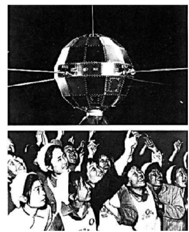 | 上图为我国第一颗人造地球卫星“东方红一号”;下图为人们争相眺望“东方红一号”通过北京上空(资料照片)。 |