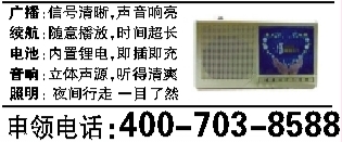 读者请注意,特大喜讯,为让中老年人的晚年更加精彩丰富健康,爱心企业专门为中老年人量身定制了一款多功能收音机,可听歌、听戏、听相声、听健康讲座,可照明,现特面向我省读者,凡符合以下条件的均可领取!