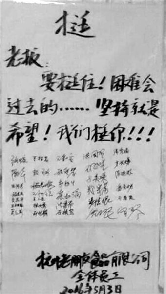 本报讯 记者孟万成 通讯员张中亮摄影报道 “老板,要挺住!困难会过去的……坚持就是希望!我们挺你!!!”日前,一则由全体员工签名的“励志书”,出现在杭州老朋友食品有限公司厂区,让正在为企业生产自救而殚精竭虑的公司老总沈国强颇为感动,“做企业几十年,今年碰到的困难最大,但我们一定会跨过这个坎,为了这么多老伙计,也为了‘老朋友’这块来之不易的牌子。”老沈说。