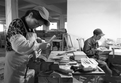 地处开化县华埠镇工业功能区的浙江和艺轩家具有限公司,生产高档新古典家具——民式红木家私、新中式红木家具等,畅销北京、上海等全国各地,每年销售额达3000多万元。46岁的该企业老总陈利东是华埠人,曾在广东开过几年饭店,而后在本县从事建筑业10多年。由于建筑业在当地竞争激烈,他转身生产民式红木家私,获得市场认可,前景看好。图为技术工人正在精心雕刻。