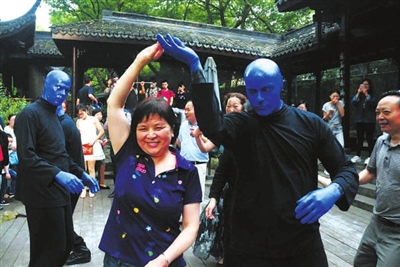 昨日,杭州西湖断桥刮起了一阵“蓝色风暴”:一群“蓝人”时而把一根巨大的废水管当演出工具,敲打出悦耳的音乐,时而跳起欢快的舞蹈,吸引了许多游客围观拍照,更有晨练的大妈大伯与他们斗起了中国的广场舞。有懂英语的游客与这些蓝人交谈,得知他们是美国著名的表演团体“蓝人”,他们最著名的演出《蓝人秀》是一台世界级舞台秀,在美国家喻户晓。