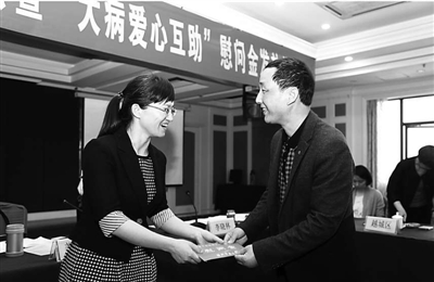 近日,绍兴市总工会举行职工医疗互助保障“大病爱心互助”慰问金发放仪式,103名大病职工共领取慰问金51.5万元。这103名职工在2014年度、2015年度参加职工医疗互助保障期间,因患重大疾病在基本医保报销后自付部分在职工医疗互助保障再次累计报销达到1万元以上。图为绍兴市总工会副主席姜链平(左)向患病职工发放“大病爱心互助”慰问金。