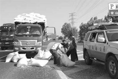 近日,常山县公路管理局的城北路政中队巡查205国道与朱富线平交口时,发现一辆皖JK0206的货车由于车速过快,车上运载的近10大袋玉米掉落下来,抛洒大半幅路面。路政中队的舒志鸿和郑东泉见状,立即设置标志,一边帮忙搬运抛洒物,以确保205国道的行车安全。
