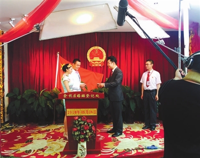 据介绍,目前省内各婚登处共有2种颁证方式和4套颁证词,新人可自选。目前,省民政厅正在推进建设“特邀颁证师”的“资源库”,今后新人可邀请政府官员、社会名人为自己颁证,也可以选择自己的亲友完成,或者以更加个性化的方式在婚登处举行颁证仪式。