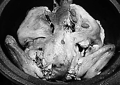 茶香鸡几乎是有了外婆家就有的一道镇店菜,一般是每桌客人必点的,但几乎所有人都碰到过没能点到的遗憾,因为鸡的数量是每天有限的,卖光为止。虽然我是一个不吃鸡的人,但是对外婆家的茶香鸡我也是非常有感觉的,鸡上桌时烫烫的砂锅中,弥散着烤鸡肉的香和西湖龙井茶特有的清香。看着同桌把筷子插进鸡肉中,一派肉嫩骨酥的样子,吃得津津有味,还不时地夸一句嫩、滑、香、鲜什么的。有一次我居然完全忘记自己是不吃鸡的人,就在一只鸡很快被蚕食露出锅底时,发现还有一双鸡爪卧于油汪汪的汤汁中,情不自禁地捞来吃,一种前所未有的鲜美震撼了我,从此,我把“不吃鸡”改成“只吃鸡爪”了。