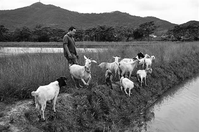 养殖过程中,曹澄波发现鱼塘边还剩很多的空地,长满杂草,于是他尝试放养一些羊来增加收入。他购进5头母羊和7头肉羊,开始了混合养殖。