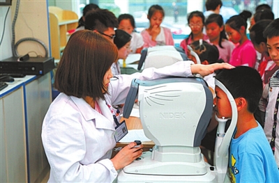 图为衢州市人民医院眼科医生为每位学生免费提供视力检查服务。