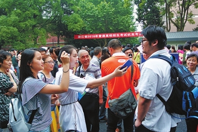 昨天下午5时差8分,2位完成英语高考的男生,率先走出杭州高级中学考点,引来众多等候着的家长无比羡慕的目光,让人见识了啥叫“学霸”。一位美女记者赶忙上前采访,英语考题难吗?考完了,你现在最想什么?男生笑答,不难!最想啥都不想(左图)。