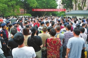 5时过后,大批考生走出考点,维持秩序的警察铆足了劲,还是挡不住蜂拥上前、“热情似火”的家长(右图),一位考生幽默地喊道,敢问路在何方?