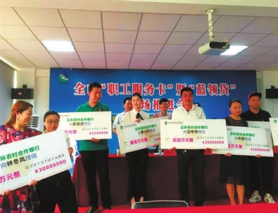 本报讯 记者孟万成 通讯员林茜摄影报道 日前,台州市“职工服务卡”暨“蓝领贷”现场推进会在玉环县召开,来自台州市各县市区总工会主席、农合行行长等近百人见证了玉环农村合作银行向该县总工会进行2016年度总体额度授信2亿元,并当场向8位符合条件的职工发放“蓝领贷”140万元。台州市总工会党组书记、常务副主席黄祥云表示,希望借助政银合作的方式,以职工服务卡的形式打造工会服务职工的新平台、实施普惠式服务的有效载体、参与推动小微企业金融政策的普及。