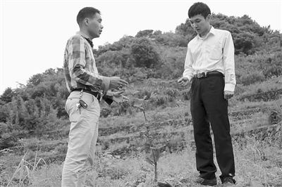 香榧子是一种红豆杉科植物的种子,其果实外有坚硬的种皮包裹,大小如枣,核如橄榄,两头尖,呈椭圆形。常食用香榧子对润肺化痰、滑肠消痔、健脾补气等具有良好作用。图为方先宝(左)向我们介绍香榧种植情况。