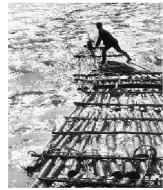 放排最惊心动魄的,莫过于发大水的时节。汛期,苕溪一改平时温文尔雅,霎时变得张狂不驯起来,泥沙俱下,一片浑沌。排筏在浪涛中跌宕起伏,一会儿高扬跃起升空,一会儿又低头猛扎水里,放排人随排上下如轻燕一般掠过河面。那些技高胆大的汉子赤裸着身子,穿一条破旧的裤衩,站在排上,手捏撑篙,乘风破浪,喊着排工号子,绕过险礁危岩,浩浩荡荡而去。