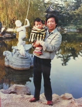 | 30年前的谢德林在花港观鱼稚子垂钓雕塑前抱着儿子。 |