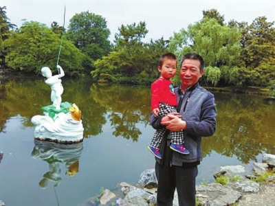 | 30年后的谢德林在花港观鱼稚子垂钓雕塑前抱着孙子。 |
