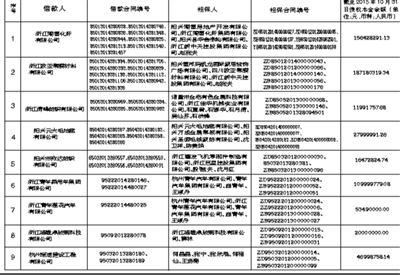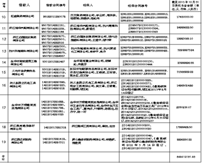 | 中国华融资产管理股份有限公司联系人:朱女士 联系电话:010-57809364 地址:北京市西城区百万庄大街甲2号院 上海浦东发展银行股份有限公司杭州分行联系人:沈女士 联系电话:0571-87366483 地址:杭州市延安路129号 注:1. 本公告清单列示暂计至2015年10月31日的贷款本金余额,借款人和担保人应支付给中国华融资产管理股份有限公司的利息按借款合同、担保合同及中国人民银行的有关规定计算。 2. 若债务人、担保人因各种原因更名、改制、歇业、吊销营业执照或丧失民事主体资格的,请相关承债主体及/或清算主体代为履行义务或履行清算责任。 3. 清单中“担保人”包括保证人、抵押人、出质人,担保人的担保范围以签署的合同等法律文件约定为准。如公告中债务人、合同编号、债权金额、担保人等信息与事实不符的,以签署的合同等法律文件约定为准。 附:转让清单 |