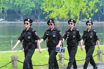 清一色的装备、整齐的步伐,统一墨镜着装。6月27日,杭州西湖景区行政执法局G20女子巡逻队在西湖白堤断桥景区巡逻,吸引了不少游人的目光。 通讯员连国庆 记者羊荣江 摄