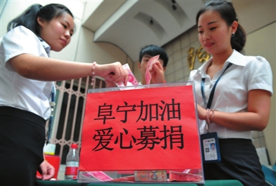 6月26日,临安市一家联合舰队装饰公司的员工在给江苏盐城阜宁灾区募捐。员工们用自己的热忱和爱心为灾区人民送去一份温暖。胡剑欢 摄影报道