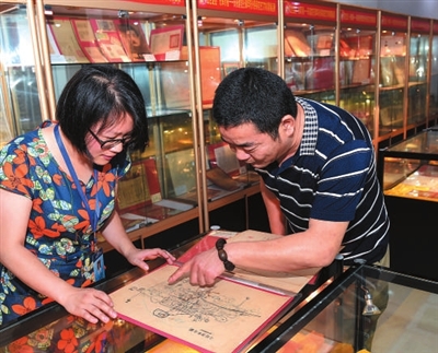 记者周金友 通讯员诸敏芳摄影报道 今天是中国共产党建党95周年的喜庆日子。在杭州西湖区留下历史文化街区“庆祝建党95周年杭州民间文物收藏精品展”的展厅里,杭州市收藏协会副会长杨海敏(图①右)指着一幅由浙江省新四军历史研究会副秘书长黄明明收藏的,1947年1月16日鲁南战役枣庄战斗军事地图,连说太珍贵了。