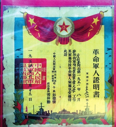 展出的珍贵藏品中,还有一份1954年11月23日,由时任西北军区司令员彭德怀,政治委员习仲勋签发的“革命军人证明书”(图③)。