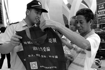 为增强群众的安全防范意识,最近,台州市公安局开发区分局制作了5000只“安全防范购物袋”,袋上印有“防火、防盗、防抢、防诈骗”等字样以及该区公安微信二维码等,组织派出所民警、消防大队官兵深入辖区,向群众免费发放。