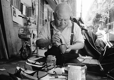 老伴张又华是他最得力的帮手,老伴现在在黄龙一家酒店洗杯子,每天晚上上班到早晨6点下班。平时只要有空,就帮着叶师傅打鞋帮。