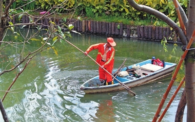 前天下午,在杭州市区上塘路大关路口的河道里,一位清洁工人撑着小船,顶着烈日在打捞漂浮在河面上的垃圾。这位工人说,“五水共治”后,杭州市内的河道变化最大,河水变清了,河岸变美了。他希望大家都能爱护河道,改变随手往河道里扔喝完的饮料瓶、废弃的塑料袋、包装物等垃圾的陋习。因为有些垃圾来不及打捞就沉到河底了,积少成多,又会成“垃圾河”的。