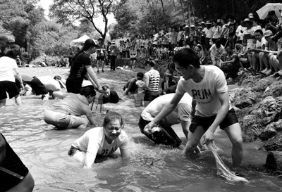 “预备,开始!”随着裁判员一声令下,几十名选手争先恐后冲向湍急的溪水中,奋力展开“浑水摸鱼”比赛活动。岸边的观众也纷纷为选手加油,到处充溢着夏日里的热情和欢笑声。