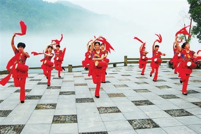 “咚咚、咚咚”……7月13日,在有着“水清、风凉、雾奇”之称的建德市新安江畔,一群身穿红色运动服装的中老年健身队员正整齐划一、跨跳轻盈、动作娴熟地演练自编的传统健身腰鼓,个个激情澎湃,吸引众多市民驻足观看。