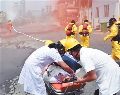 启动仪式后,杭州电化集团液氯应急救援队进行了一场应急救援实战演习,成功地排除一辆液氯槽车在充装过程中发生氯气泄漏造成的险情(右图)。