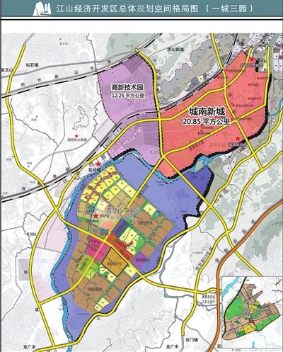 浙江省江山经济开发区是1994年8月经省政府批准设立的省级经济开发区,2005年12月通过国务院设立审核。2006年11月经省委、省政府确认为首批“山海协作示范区”,同时也是省科技厅授牌的“浙江省星火示范园”,2013年与绍兴市柯桥区共建成立“江山—柯桥山海协作产业园”。空间格局为“一城三园”(即:城南新城、莲华山工业园、江东工业园和高新技术园),总规划面积80平方公里,完成开发建设面积20平方公里,现有熟地3400亩,其中莲华山工业园2200亩,高新技术园400亩,城南新城800亩。主要发展输配电、照明电器两大主导产业,门业和消防器材两大特色产业及战略性新兴产业。截至2015年,园区规模工业企业126家,亿元以上企业55家,其中10亿元以上企业3家;共有国家级高新技术企业19家,中国驰名商标4个,省级知名品牌(商标)42个。