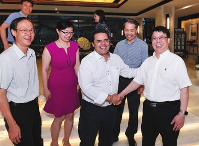 本报讯 记者周金友摄影报道 昨晚,省总工会党组书记、常务副主席戴震华(右一)代表浙江省总工会热情欢迎以塞杜瓦尔总工会总协调员路易斯·莱唐(右三)为团长的葡萄牙塞杜瓦尔总工会第7次访华团一行。省总工会党组副书记、巡视员、副主席曹国旗(左一)一同欢迎。