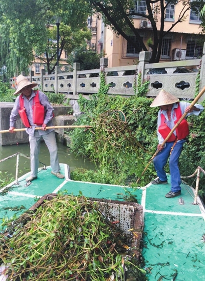 见习记者胡翀报道 7月19日,对于老沈、老董和老李来说是最后一个幸运日子,因为从手机的天气预报来看,接下来的日子,气温就将迈上35摄氏度。下午1点半,三个年龄加起来超过180岁的老伙计,穿戴好长袖、草帽,加满茶水“下河”了,等待他们的是6公里长的河道以及河面上的各种垃圾。
