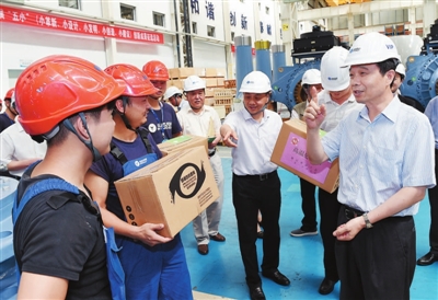 在“运达风电”长达数百米的生产区域,厉志海等边走边听取企业负责人的情况介绍,每到一个班组,厉志海就停下脚步,与一线职工亲切交谈,并一一递上慰问品。厉志海向高温天坚守在一线的职工们表示慰问和感谢,他说,高温天坚守岗位意味着比平时更多的付出,更多的辛劳,他叮嘱一线职工既要着眼于企业发展,勤勤恳恳地工作;又要着眼于防暑降温的细节,劳逸结合,保重身体。