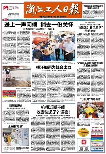 本报讯 记者阮向民报道 昨天上午,杭州市气象台发布高温橙色预警,入夏以来,最高气温首次突破38℃。省人大常委会副主任、省总工会主席厉志海,省总工会副主席李锦平等来到浙江运达风电股份有限公司,看望慰问一线职工,道一声保重身体,捎去“娘家人”的一份关怀。