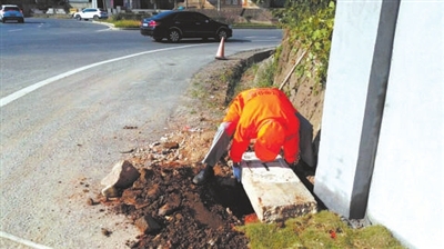 7月21日下午,气温已达39摄氏度,火热的太阳照着大地,在常山县通往芳村、新桥乡的常新线K1处,常新线K1的里程碑被大货车撞倒,县芳村公路站的养护工作人员占根才冒着高温扶起被撞的常新线K1里程碑,重新进行埋设。徐莹 朱燕平