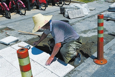 昨天上午10时15分,烈日高照。在杭州良渚博物馆门口的人行道上,3位来自湖北、都姓蔡的民工正在铺设地砖。其中一位55岁的老蔡说,杭州这天都快“烧”起来了,刚搅拌好的混凝土眨眼工夫就变成“混凝砖”,我们汗流得连裤子都湿透了。杭州就要迎G20峰会了,我们要和太阳抢时间,这边搅拌,那边铺砖,一点都不敢耽误。良渚博物馆是许多外国人最爱来的地方,我们得让这里漂漂亮亮地迎接贵宾。苦点、累点都不算啥,只要以后杭州记得我们在最热的天流过大汗,做过贡献,就值了。