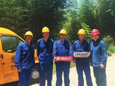 | 国网杭州供电公司输电运检工区工会副主席李璠(右一)等到工作现场送清凉慰问。 记者羊荣江 摄 |