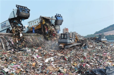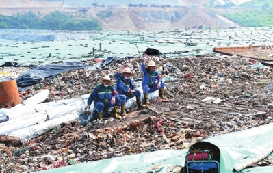 | 垃圾填埋场工人奋战高温、恶臭。 |